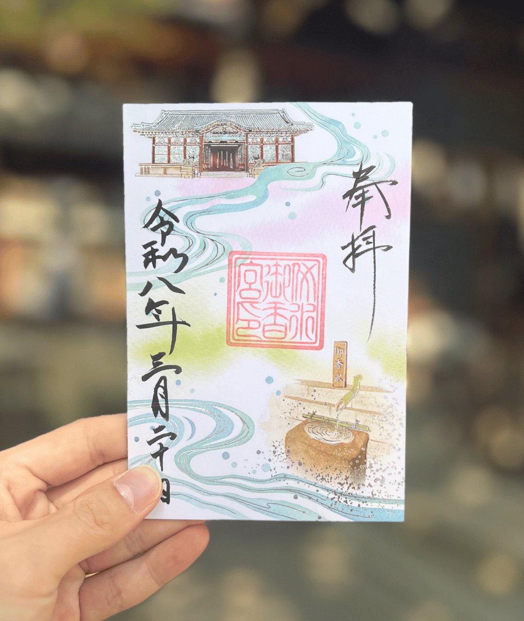 名水百選にも選ばれた当社の「御香水」をイメージした箔押しの煌びやかな御朱印です。